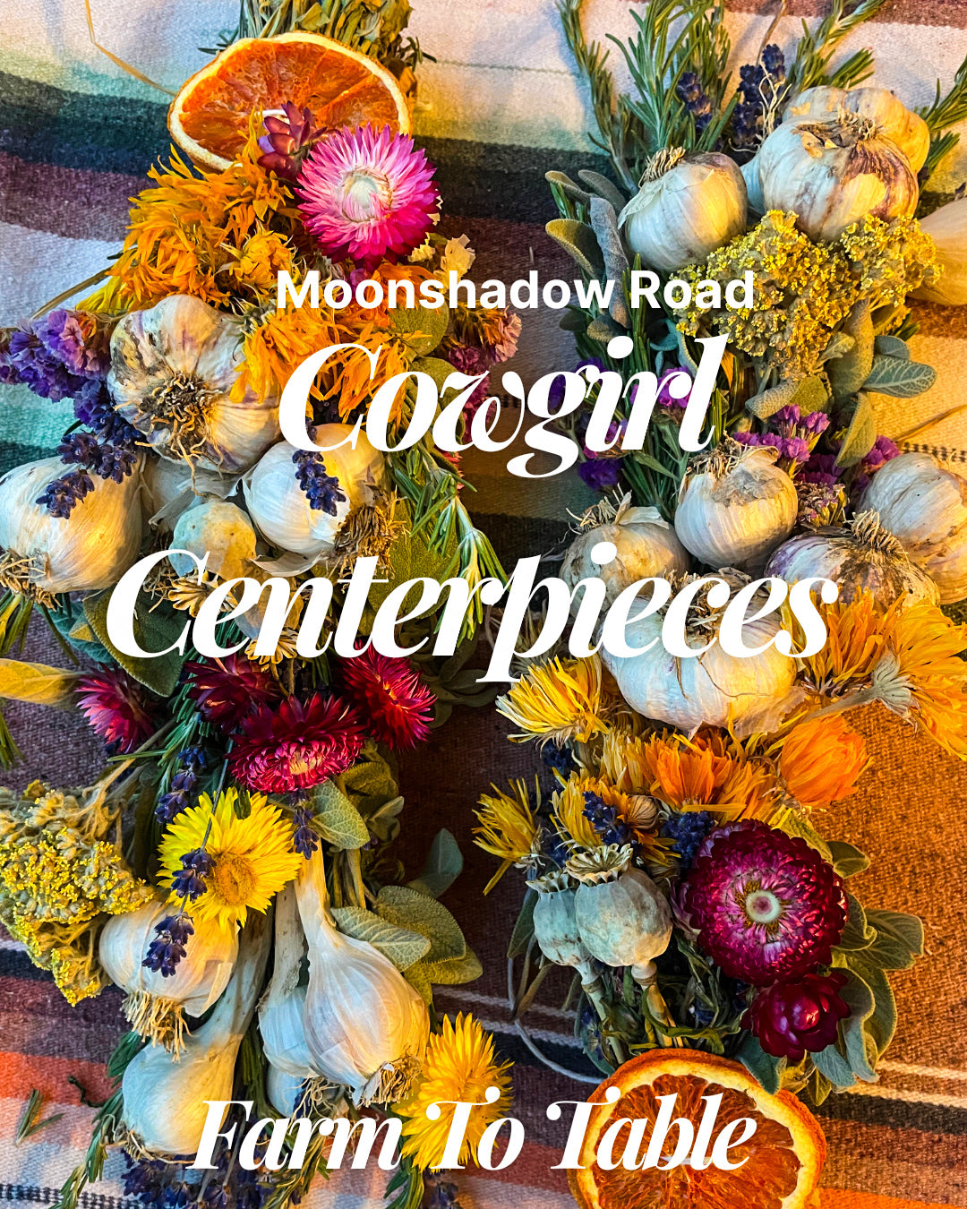 Cowgirl centerpieces are a beautiful blend of weapon to showcase all that the garden has to offer. Handmade with organic flowers and herbs that were grown right here on our little 6 acre farm [ Besides the oranges of course ] . These beauties will give your table a gorgeous glow for months . Handcrafted with garlic , rosemary , sage , lavender, strawflowers, yarrow , calendula and statice to give you the beauty of the garden right at your table . These will be the centerpiece of any cowgirls holiday events .